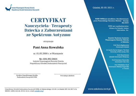 - Po ukończeniu szkolenia uczestnicy otrzymują Certyfikat Nauczyciela-Terapeuty Dziecka z Zaburzeniami ze Spektrum Autyzmu. Warunkiem otrzymania zaświadczenia jest uczestnictwo we wszystkich częściach szkolenia.